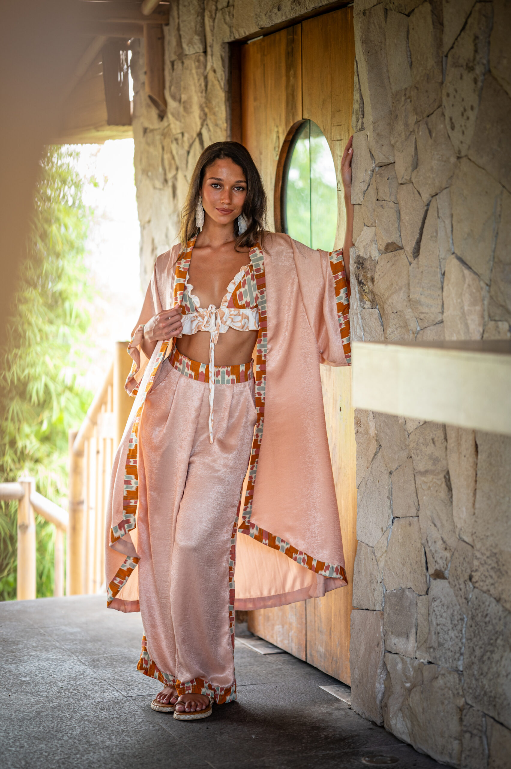 The Indira Pants combine comfort and sophistication with their wide-leg cut and satin-feel fabric. The relaxed fit flows gracefully, while the vibrant patterned waistband and hem bring a pop of color and artisanal flair. Perfect for lounging in style or dressing up for resort evenings.